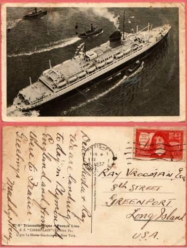 Il n'y a pas de timbre émis illustrant le Champlain, seul le Pasteur eut droit à ce privilège avant la seconde guerre mondiale, avec bien entendu, l'illustre Normandie !